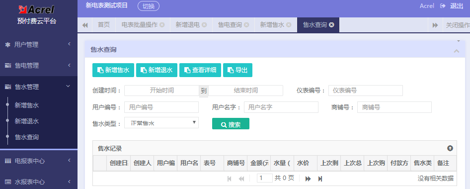 The system provides newly added water sales, recharging, retiring, detailed and classified query.